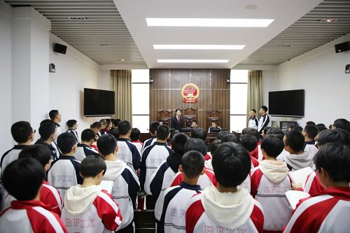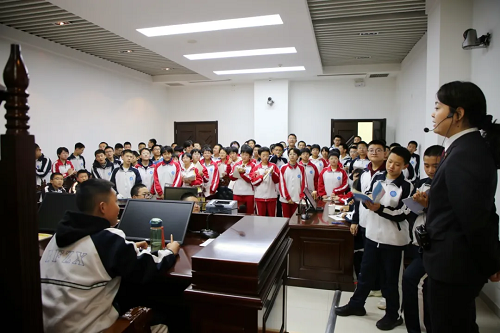 “同學(xué)們,這邊是我們的安檢通道,進(jìn)入法院的人員需要在這里接受安全檢查,所有違禁物品是不能進(jìn)入法院的?!痹诜ㄔ褐v解員的帶領(lǐng)下,同學(xué)們先后參觀了訴訟服務(wù)中心、陽(yáng)光大廳、審判法庭、法治宣傳教育室、院史陳列室等場(chǎng)所,認(rèn)真觀看了中院全面建設(shè)專題片和中院干警自編自導(dǎo)自演的預(yù)防未成年人犯罪題材法治微電影《你依然是天使》,全面了解了法院的職能作用、機(jī)構(gòu)設(shè)置、辦案流程和歷史文化等情況。