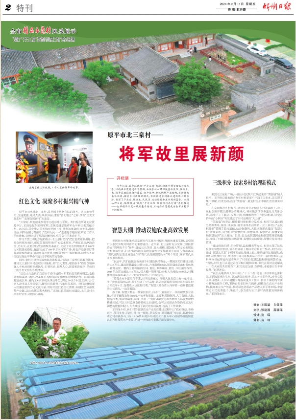 開欄語 今年以來,我市以踐行“千萬工程”經(jīng)驗(yàn)、推進(jìn)鄉(xiāng)村全面振興為抓手,以精品示范村建設(shè)為引領(lǐng),加快農(nóng)村人居環(huán)境整治步伐,推動水、電、路等基礎(chǔ)設(shè)施向村覆蓋、向戶延伸;積極調(diào)整產(chǎn)業(yè)結(jié)構(gòu),不斷壯大集體經(jīng)濟(jì);探索鄉(xiāng)村治理新模式,不斷推進(jìn)鄉(xiāng)村振興建設(shè)邁上新臺階,書寫了產(chǎn)業(yè)興、環(huán)境美、民風(fēng)淳、生活好的和美鄉(xiāng)村新篇章。本報(bào)從即日起,陸續(xù)推出“踐行‘千萬工程’經(jīng)驗(yàn)忻州在行動”系列報(bào)道——全市精品示范村風(fēng)采展示特刊,讓精品示范村成為全市鄉(xiāng)村學(xué)習(xí)的標(biāo)桿。