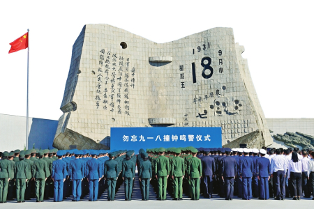 圖①:9月18日,在沈陽(yáng)“九·一八”歷史博物館殘歷碑廣場(chǎng)拍攝的“勿忘九一八”撞鐘鳴警儀式現(xiàn)場(chǎng)。