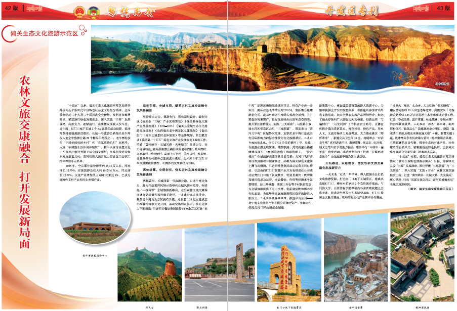 農(nóng)林文旅交康融合 打開發(fā)展新局面 “十四五”以來,偏關(guān)生態(tài)文化旅游示范區(qū)始終堅(jiān)持以習(xí)近平新時(shí)代中國特色社會(huì)主義思想為指導(dǎo),全面貫徹黨的二十大及二十屆歷次全會(huì)精神,按照省市部署要求,堅(jiān)定踐行綠色發(fā)展理念,深入實(shí)施“三綠”發(fā)展戰(zhàn)略,向新發(fā)力,逐綠前行,高質(zhì)量發(fā)展駛?cè)肟燔嚨?。老牛灣、紅門口地下長城2個(gè)4A級(jí)景區(qū)成功創(chuàng)建,乾坤灣獲批省級(jí)旅游度假區(qū);長城一號(hào)旅游公路偏關(guān)老牛灣段入選全省旅游公路28個(gè)精品示范段之一;老牛灣村獲得“中國美麗休閑鄉(xiāng)村”和“農(nóng)家樂特色村”雙稱號(hào),入選“中國慢生活休閑體驗(yàn)區(qū)”,被中央宣傳思想文化工作領(lǐng)導(dǎo)小組評(píng)為第七屆全國文明村;水泉村獲評(píng)省級(jí)鄉(xiāng)村旅游重點(diǎn)村;黃河宿集入選首批山西省總工會(huì)職工療休養(yǎng)服務(wù)點(diǎn)名單。 2025年,全縣累計(jì)接待游客約85.13萬人次,同比增長12.79%;實(shí)現(xiàn)旅游總收入約10125.6萬元,同比增長12.79%。文旅產(chǎn)業(yè)增加值占GDP比重達(dá)6%,已成為戰(zhàn)略性支柱產(chǎn)業(yè)和民生幸福產(chǎn)業(yè)。 規(guī)劃引領(lǐng)、全域布局,擘畫農(nóng)林文旅交康融合發(fā)展新圖景 堅(jiān)持高點(diǎn)定位,規(guī)劃先行,強(qiáng)化頂層設(shè)計(jì),編制完成《偏關(guān)縣“三綠”產(chǎn)業(yè)發(fā)展規(guī)劃》《偏關(guān)縣綠色文旅產(chǎn)業(yè)發(fā)展規(guī)劃》(2026-2035)《偏關(guān)縣全域生態(tài)文化旅游發(fā)展規(guī)劃》《山西偏關(guān)老牛灣景區(qū)總體規(guī)劃》《偏關(guān)紅門口地下長城景區(qū)總體規(guī)劃》等總體規(guī)劃,并加緊啟動(dòng)《偏關(guān)縣“十五五”綠色文旅產(chǎn)業(yè)發(fā)展規(guī)劃》編制工作,明確“黃河峽谷·長城天路·大美偏關(guān)”品牌定位,突出地域特色,將兩條旅游公路沿線的老牛灣村、乾坤灣村、萬家寨村、樺林堡村、高家上石會(huì)村、關(guān)河口村、水泉堡、老營堡等古村落串點(diǎn)連線成片規(guī)劃,為未來5年乃至15年發(fā)展提供前瞻性、可操作的發(fā)展路徑與目標(biāo)。 高位統(tǒng)籌、全鏈創(chuàng)優(yōu),夯實(shí)農(nóng)林文旅交康融合發(fā)展新基礎(chǔ) 依托黃河、長城兩條一號(hào)旅游公路,以老牛灣為龍頭,著力打造黃河風(fēng)情示范帶和長城風(fēng)情示范帶,構(gòu)建起“一核兩帶”全域旅游新格局,走出農(nóng)林文旅交康深度融合高質(zhì)量發(fā)展的偏關(guān)路徑。一是建好龍頭強(qiáng)帶動(dòng)。聚焦老牛灣龍頭景區(qū)提檔升級(jí),總投資1.24億元建成老牛灣黃河國家文化公園,基礎(chǔ)設(shè)施明顯提升,核心競(jìng)爭力不斷增強(qiáng);引進(jìn)西貝餐飲集團(tuán)投資5300余萬元打造“老牛灣”品牌冰滴醋釀造展示項(xiàng)目,特色產(chǎn)業(yè)進(jìn)一步鞏固;提標(biāo)改造老牛灣民宿200間,重新整合組建游船公司,成功啟動(dòng)老牛灣碼頭規(guī)范化運(yùn)營,并引資盤活閑置資產(chǎn),提標(biāo)改建碼頭民宿和星空酒店,提升景區(qū)接待能力。實(shí)施“三關(guān)聯(lián)動(dòng)”,與準(zhǔn)格爾旗、清水河相鄰景區(qū)共啟“三地聯(lián)盟”,深度參與“黃河幾字彎”區(qū)域協(xié)同發(fā)展,加快把老牛灣打造成具有國際影響力的標(biāo)志性黃河文化旅游景區(qū)。二是補(bǔ)齊短板強(qiáng)基地。全長170.5公里的黃河1號(hào)、長城1號(hào)旅游公路全線貫通,準(zhǔn)朔鐵路、靈河高速公路相繼建成通車,336國道改線工程順利竣工,“快進(jìn)慢出”全域旅游交通體系日益完善;關(guān)河口飛行營地低空旅游項(xiàng)目加緊推進(jìn),必將為偏關(guān)綠色文旅插上騰飛的翅膀。引進(jìn)斯維登集團(tuán)成功運(yùn)營關(guān)河口驛站,引進(jìn)山西紅門口旅游產(chǎn)業(yè)開發(fā)有限責(zé)任公司成功運(yùn)營紅門口地下長城景區(qū),特別是黃河·乾坤集高端民宿成功運(yùn)營,全縣餐飲、住宿等保障水平顯著增強(qiáng),加上樺林堡、高家上石會(huì)等鄉(xiāng)村民宿打造,為全域旅游提供了有力支撐。創(chuàng)新建成乾坤灣共享有機(jī)農(nóng)場(chǎng),為乾坤灣省級(jí)旅游度假區(qū)康養(yǎng)旅游注入新活力。三是優(yōu)化服務(wù)強(qiáng)保障。推進(jìn)平臺(tái)公司——老牛灣文化旅游產(chǎn)業(yè)有限公司盤活資產(chǎn)、市場(chǎng)運(yùn)作,依托關(guān)河口驛站建成全域旅游集散中心,建設(shè)偏關(guān)縣智慧旅游大數(shù)據(jù)中心,為旅客提供全方位的旅游服務(wù);積極組織參加省內(nèi)外農(nóng)文旅活動(dòng),加大全縣農(nóng)文旅產(chǎn)品營銷推介,架起了偏關(guān)好物和廣大游客之間的橋梁。創(chuàng)新運(yùn)營“與偏同行”“與關(guān)同程”2個(gè)抖音官方賬號(hào),直播宣傳推介偏關(guān)景區(qū)景點(diǎn)、特色民宿、特色產(chǎn)品、歷史人文,文旅市場(chǎng)活力充分釋放。大力推動(dòng)景區(qū)“廁所革命”,新建公共衛(wèi)生間38座。持續(xù)舉辦“對(duì)話老牛灣”系列訪談欄目,邀請(qǐng)蒙曼、任志宏、紀(jì)連海、錢文忠等知名學(xué)者助力偏關(guān);隆重舉行“中國年·偏關(g